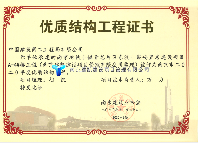 地铁小镇项目2号楼荣获优质结构工程证书