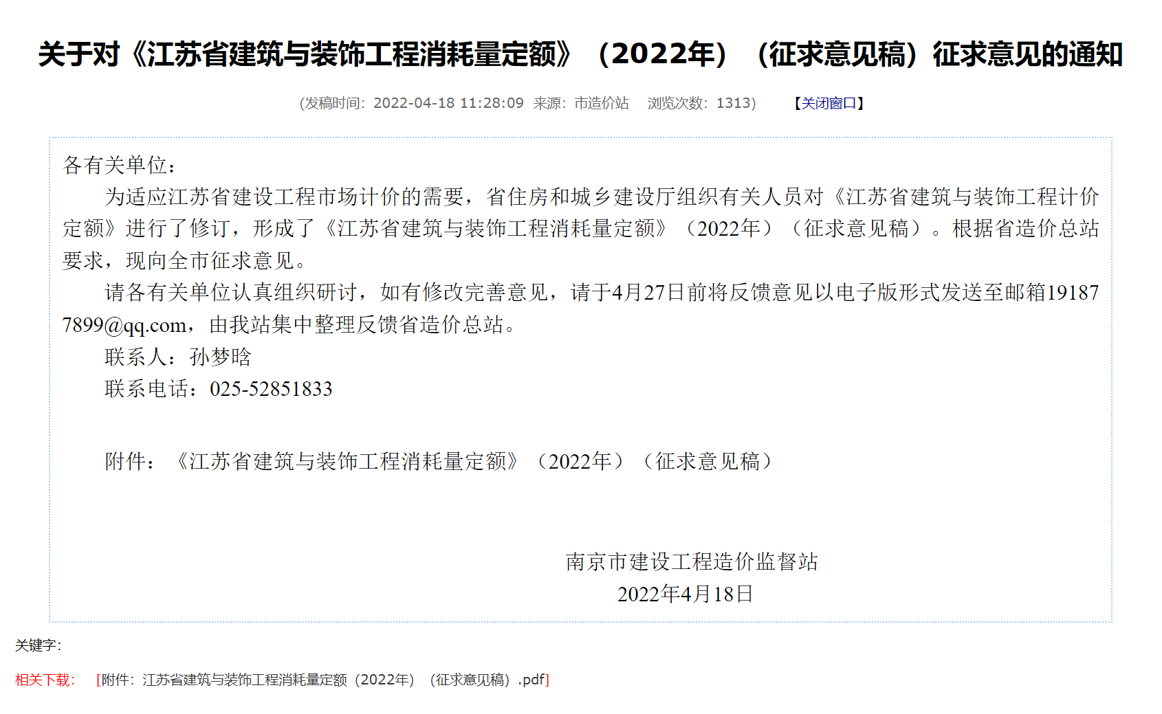 转发宝威BVSports(中国)对《江苏省建筑与装饰工程消耗量定额》(2022年) (征求意见稿) 征求意见的通知,其下载连接如下所示: