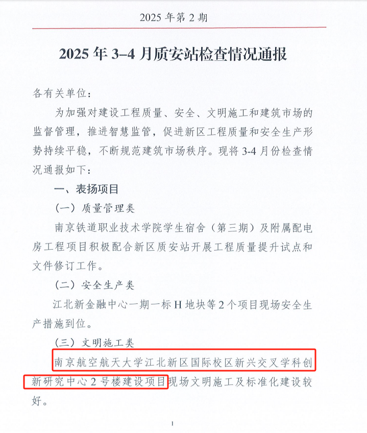 南京航空航天大学江北新区国际校区新兴交叉学科创新研究中心2#楼项目荣获区通报表扬